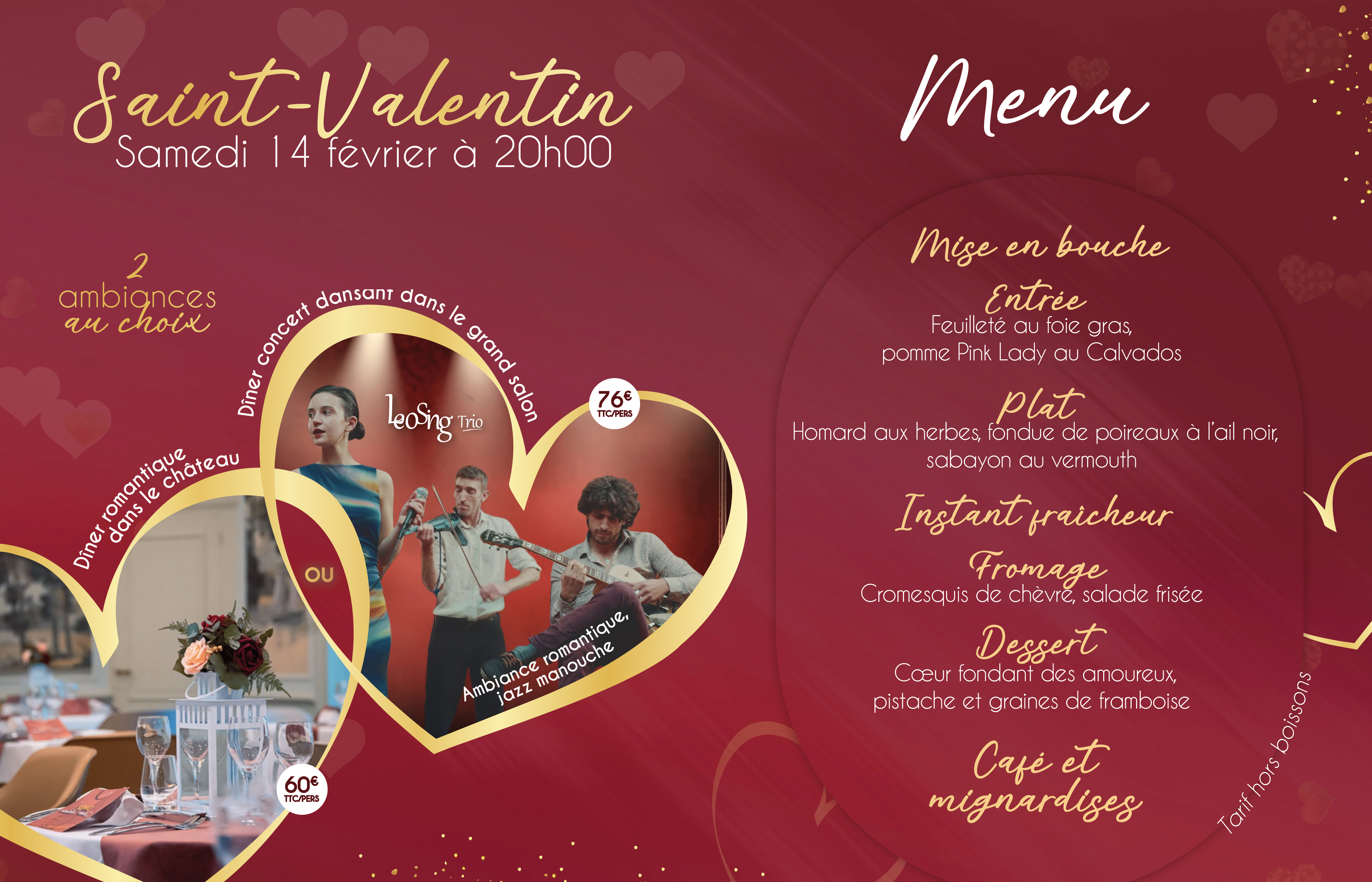 Dans le grand salon, laissez-vous séduire par une ambiance romantique et jazz manouche avec le Trio Leosing. Une soirée musicale chaleureuse, propice à la danse et aux instants partagés. - Dîner dans le château